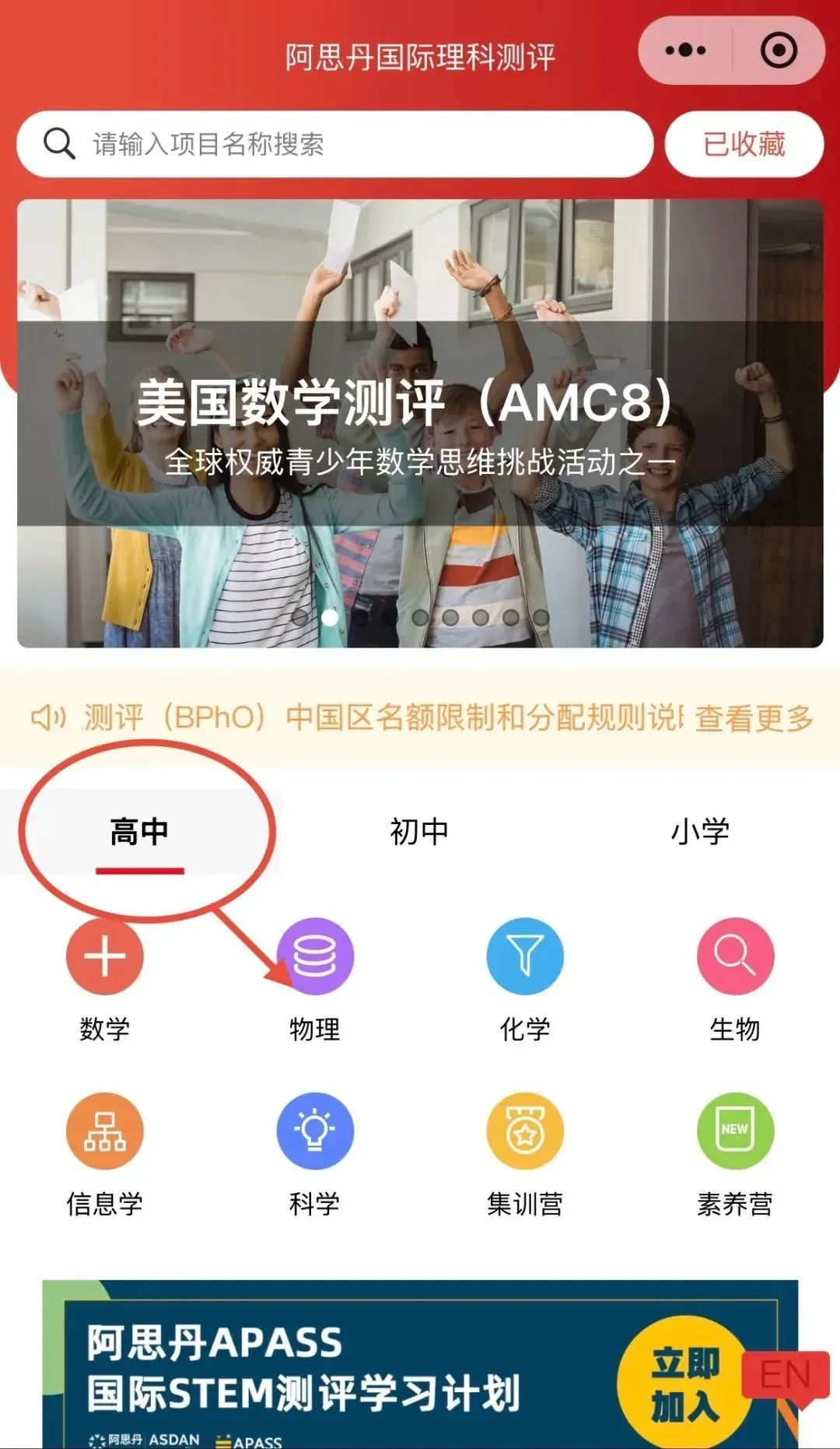 第一步:登陆微信小程序“阿思丹国际理科测评”