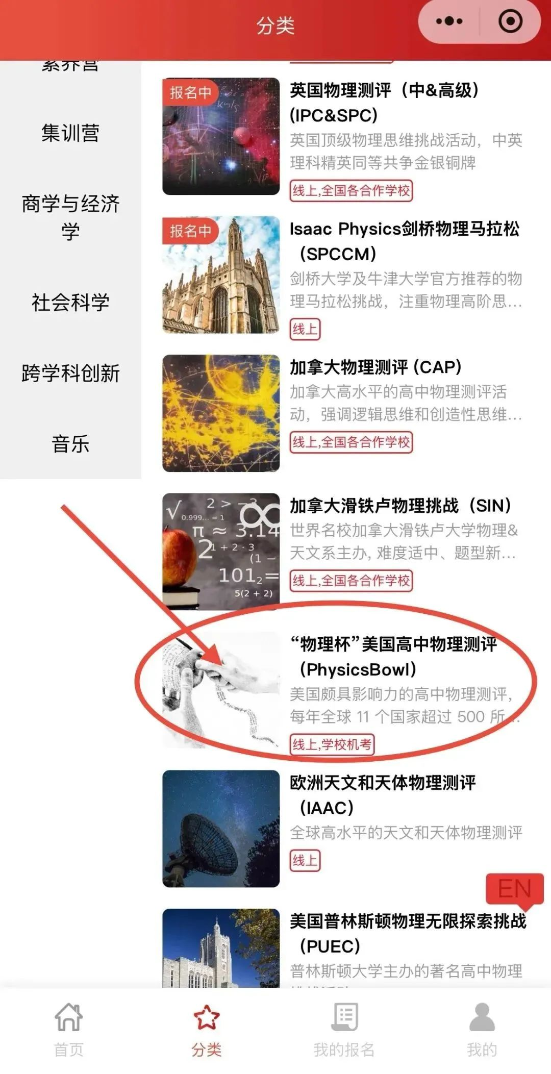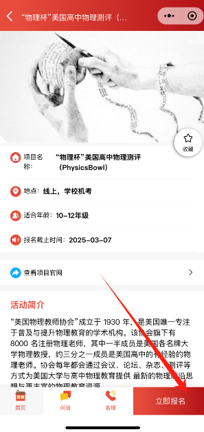 第三步:下滑选择“物理杯”并点击进入,点击“立即报名