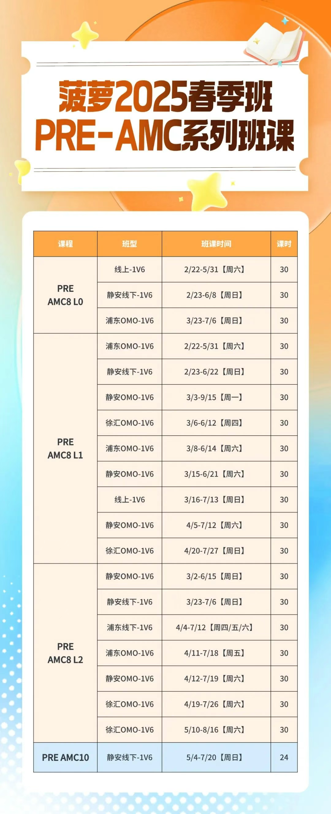 我们有PRE AMC8 L0/L1/L2、AMC8、PRE AMC10、AMC12 等多种班型,线上线下同步教学,零竞赛基础学生也可以参加学习。