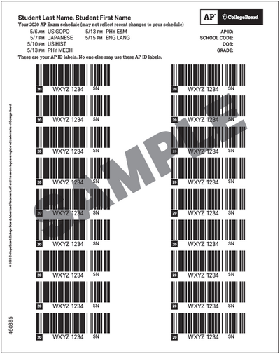 每个考生在参加所报第一门考试当日,监考人员将发放一张学生专属的AP ID的条码贴纸(label sheet),考试时需要撕下条码贴到答题卡和答题册的指定位置。请妥善保存,每门考试都需要带到考场: