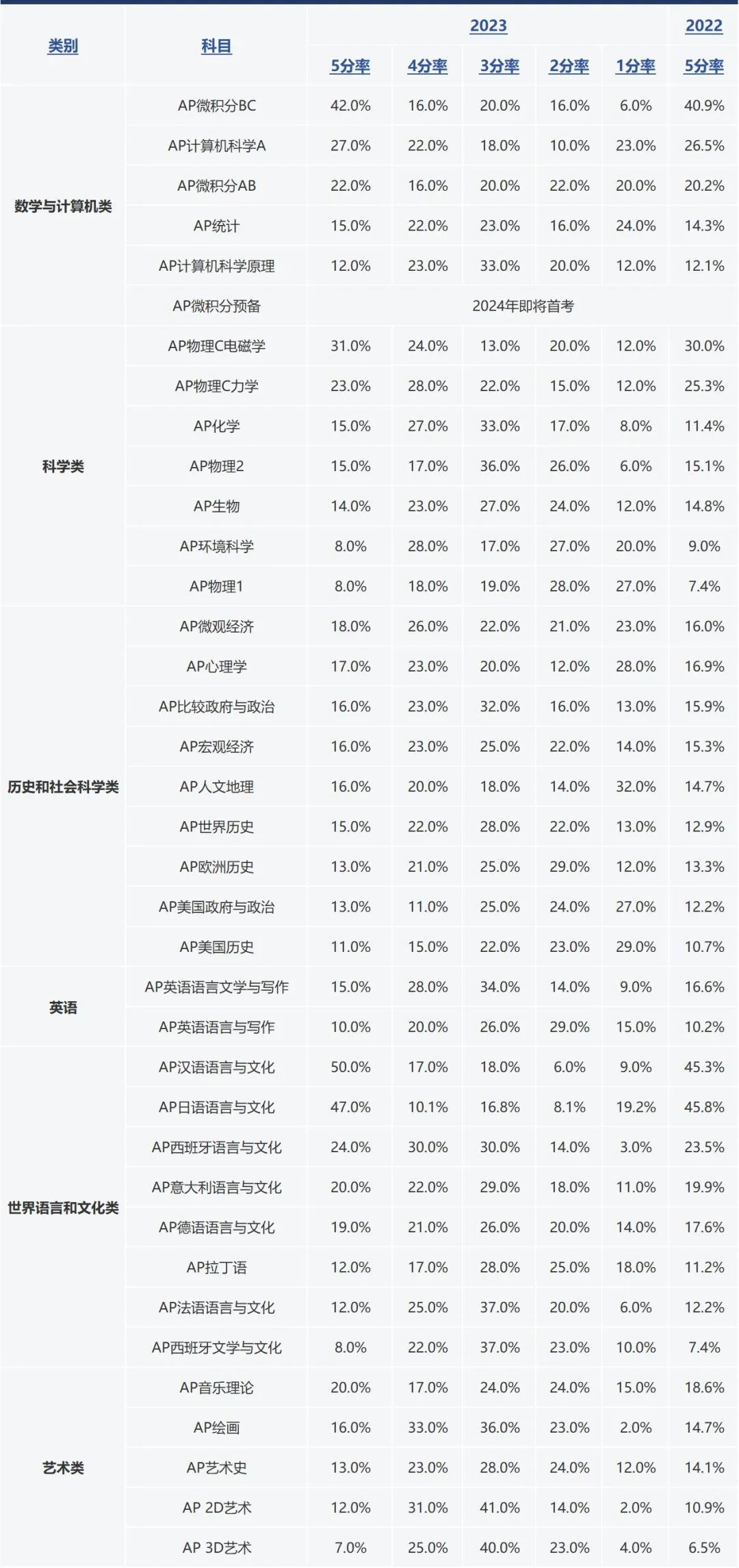 汇总了全部 38 门 AP 科目的 5 分率信息,供同学们参考。其中,2023年各科目的5分率整体上升,科学类部分科目5分率下降!